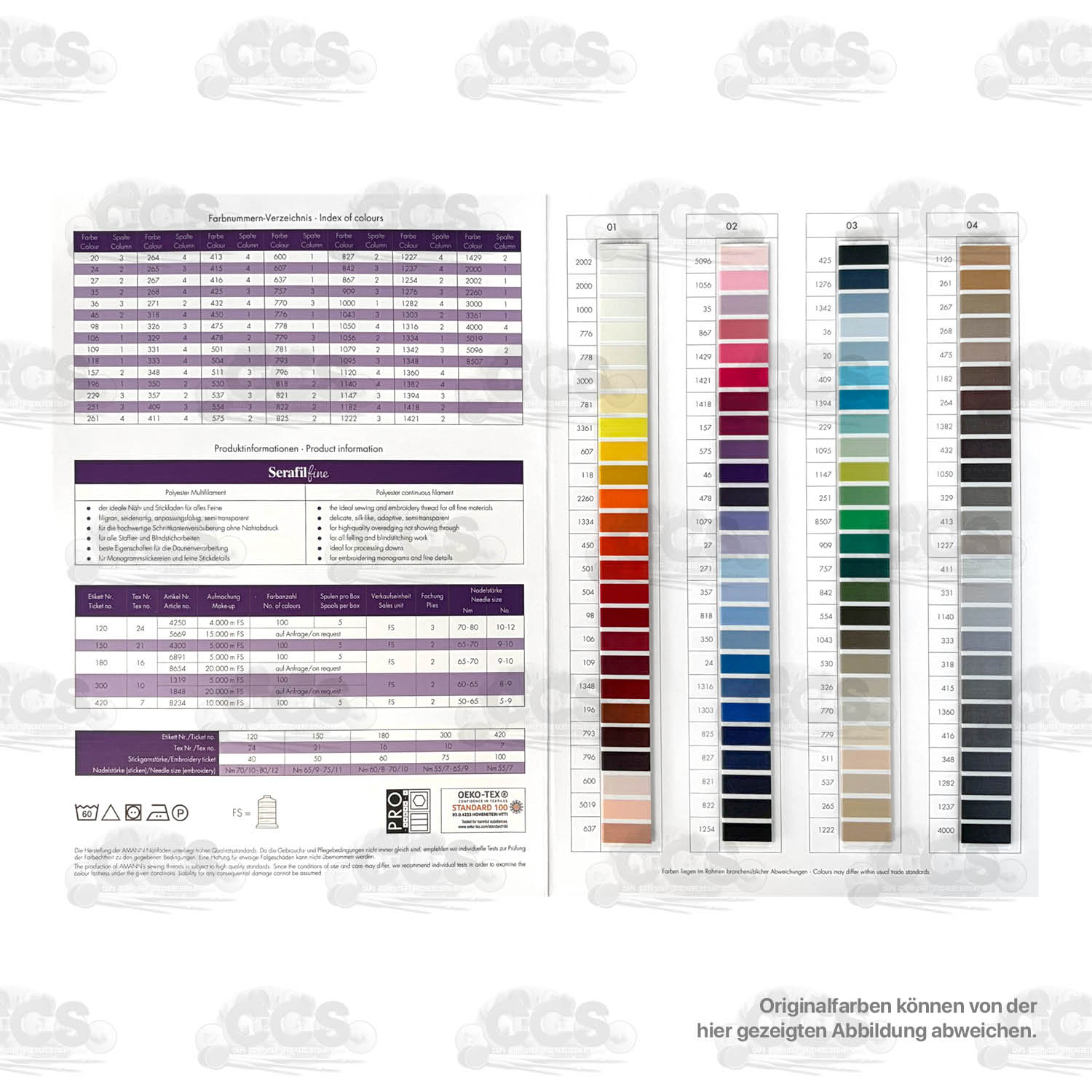 Diese Farbkarte enthält Garn-Abschnitte von 100 Serafilgarn-Farben der Firma Amann,