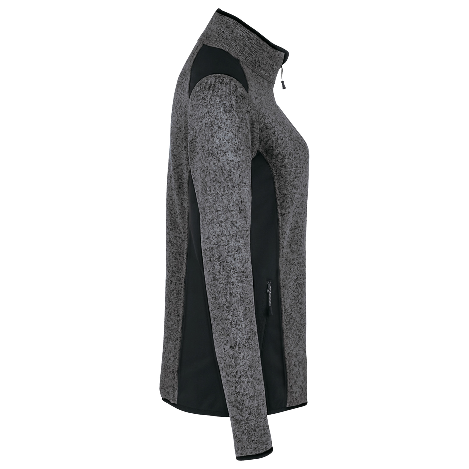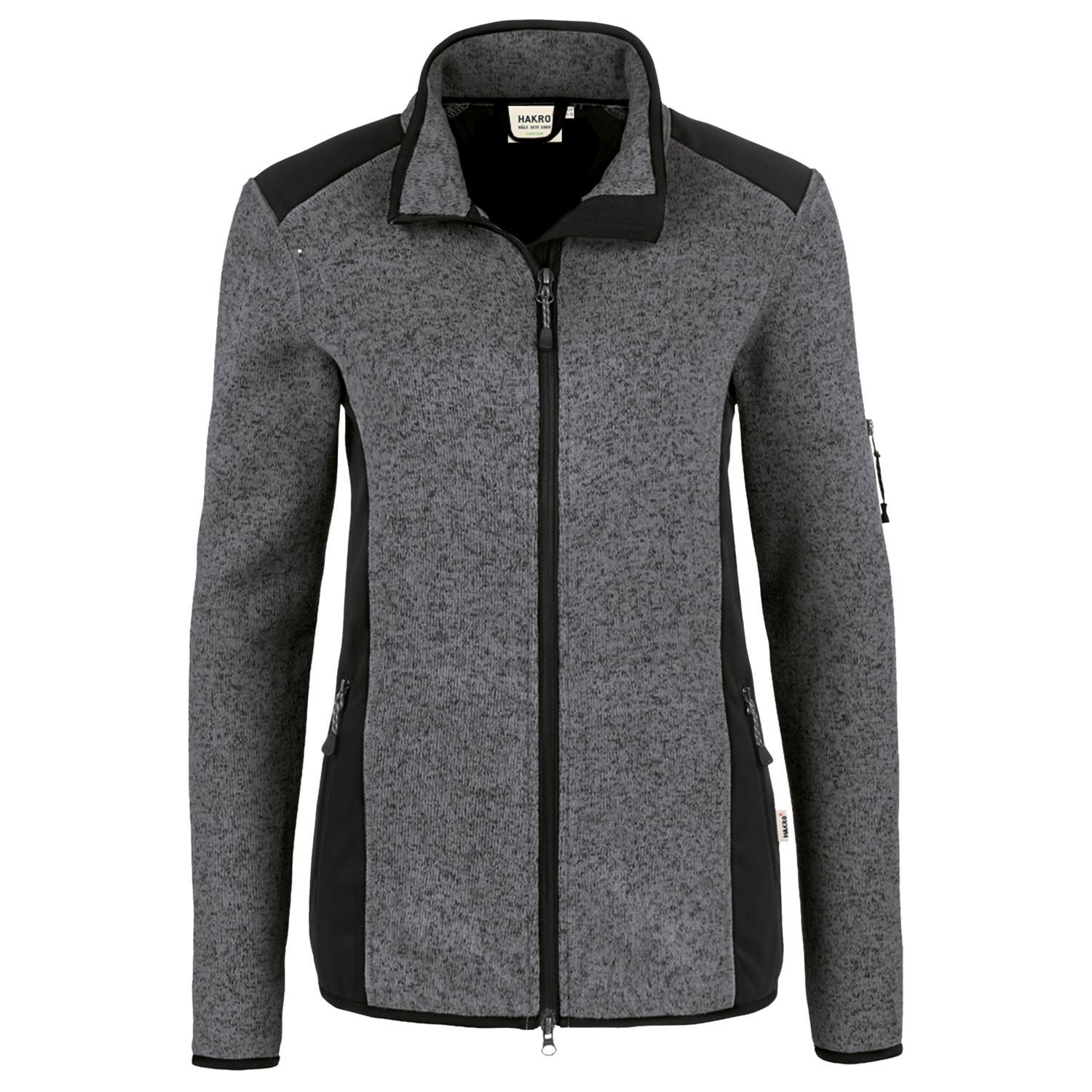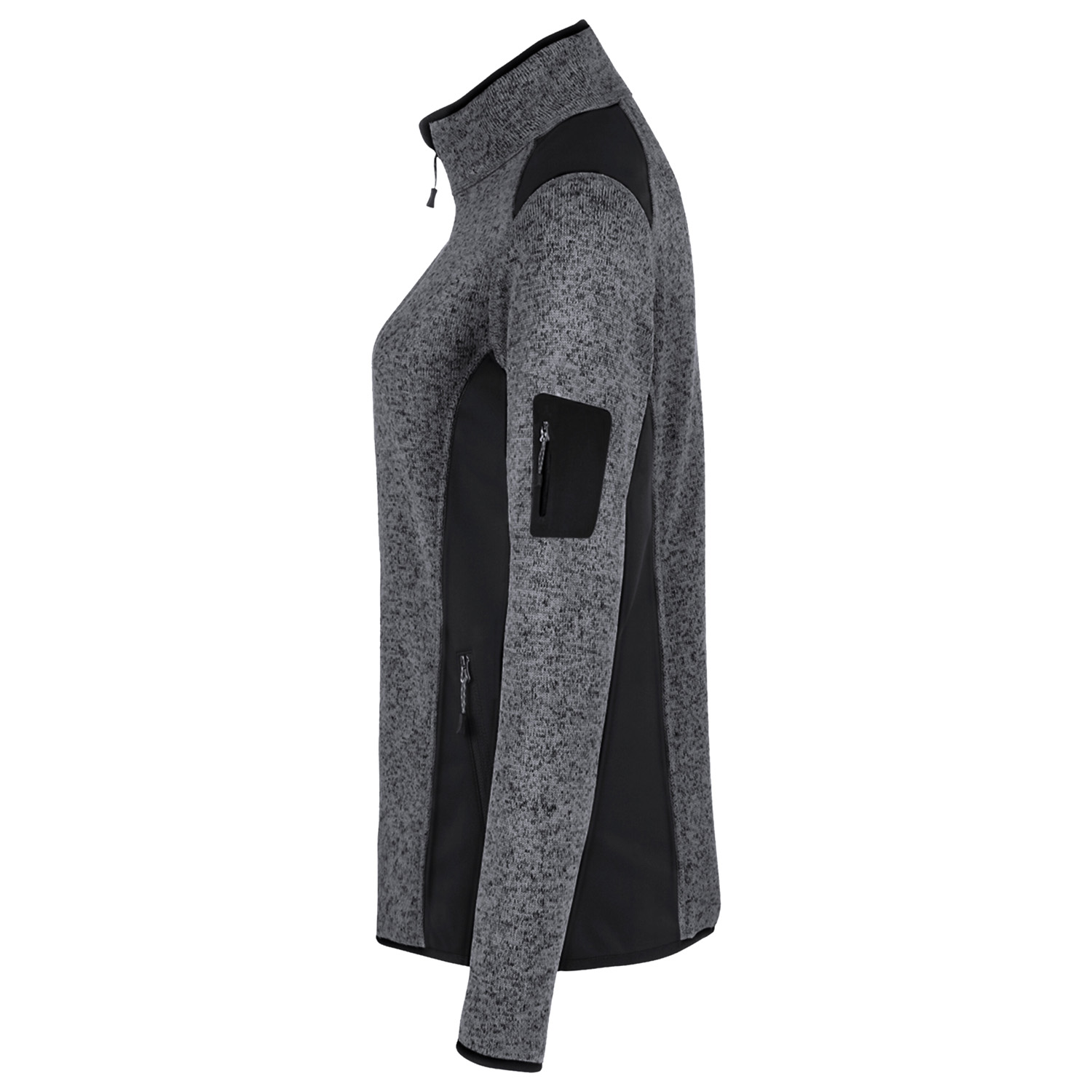 Zwei praktische seitliche Reißverschluss-Einschubtaschen und eine Reißverschluss-Ärmeltasche aus Softshell am linken Arm