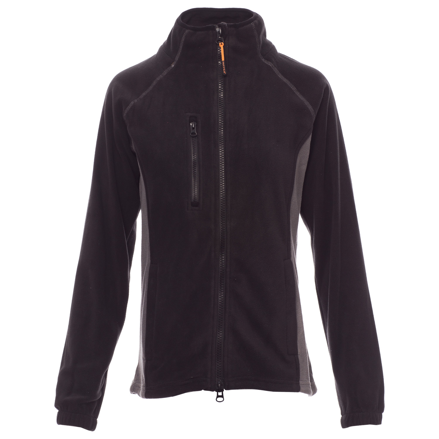 Zweifarbige taillierte Damen-Fleecejacke mit durchgehendem, schwarzem 8 mm Reißverschluss aus Kunststoff, Raglanärmeln, regulierbarem Kordelzug in der Taille, elastischen Ärmelbündchen, zwei Taschen mit verdecktem Reißverschluss, einer Vordertasche mit Reißverschluss, Kragen mit verstärktem Rand in Kontrastfarbe, verstärkten Nähten.