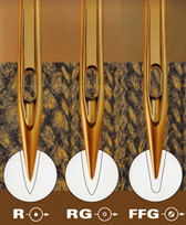 Spitzenform: Einsatzgebiete:RG leicht gerundete SpitzeMaschenware (z.B. Strickware, Jersey) und Gewebe (z.B. Hemden-, Jeansstoffe, Frottee, Seide, Microfaser)R scharfe SpitzeLeder-, Kunstleder-, Lackmaterialien (Stichdichte reduzieren)FFG leichte KugelspitzeGewebe (beschichtete, verstärkte Materialien