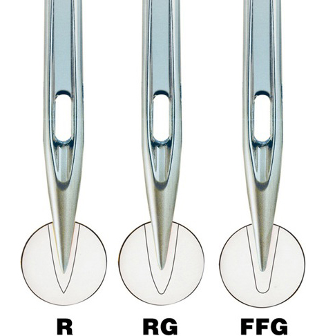 Spitzenform: Einsatzgebiete:RG leicht gerundete SpitzeMaschenware (z.B. Strickware, Jersey) und Gewebe (z.B. Hemden-, Jeansstoffe, Frottee, Seide, Microfaser)R scharfe SpitzeLeder-, Kunstleder-, Lackmaterialien (Stichdichte reduzieren)FFG leichte KugelspitzeGewebe (beschichtete, verstärkte Materialien